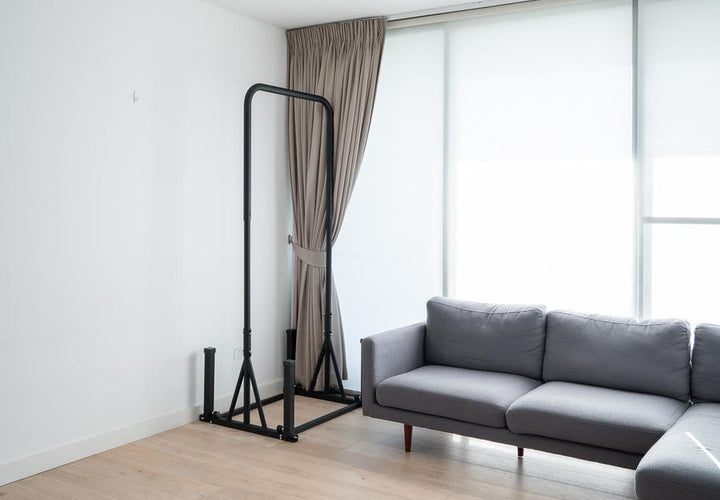 Our full-sized pull-up bar designed for small spaces. 81” tall, for taller users and designed to fit the majority of apartment ceilings (including enough clearance for your head above the bar during workouts). Perform chin-ups, pull-ups and core work. Ring-friendly, band-friendly, and a secret 45” height for rows and dips. Foldable feet for compact storage, completely standalone and our signature thick bar to develop serious grip strength.