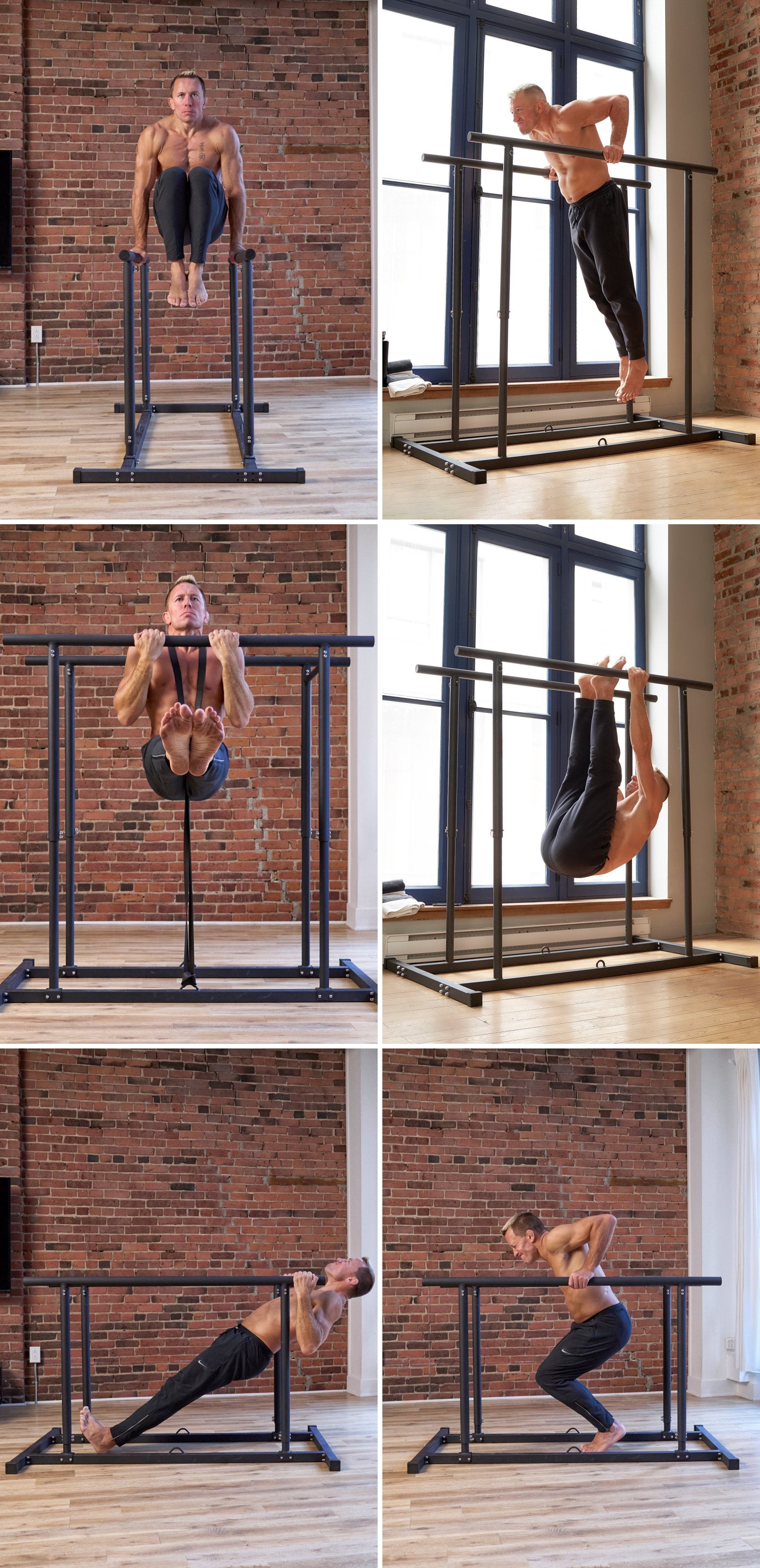 Our dual-height parallel bars built for serious home gyms. Build upper body and core strength using gymnastics-styled workouts - a tall height (59”) to perform hanging exercises like pull-ups, leg raises and levers, and a low height (37”) to perform dips, rows and L-sits. Designed with a wide and long base to support swinging and explosive exercises while being completely freestanding, with a band-anchor to make exercises harder without using a weight vest. Co-designed by Georges St-Pierre.