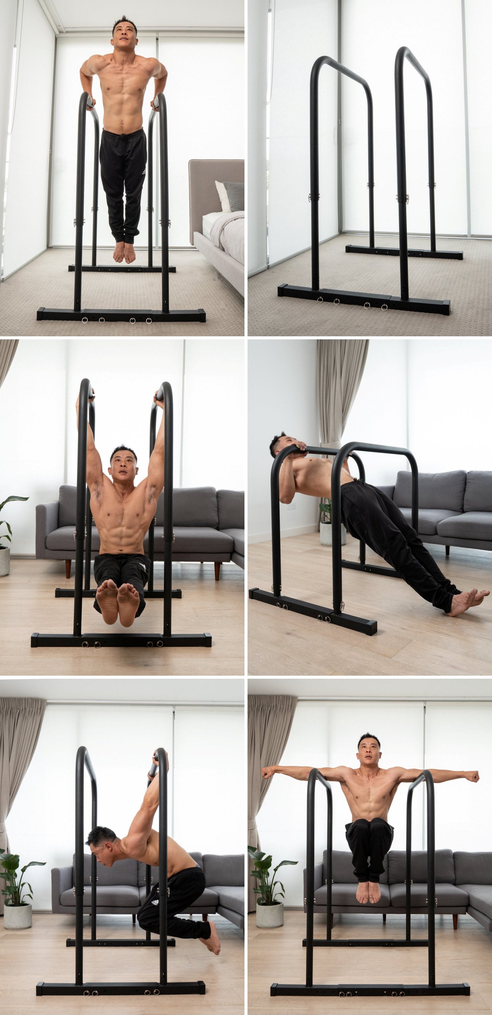 Meet our height- and width-adjustable parallel bars. Build complete upper body and core strength - perform chin-ups, pull-ups and leg raises from our top height (51”), and dips, levers and rows from our bottom height (36”). Width-adjustable (16.5” to 24”) for all shapes and sizes. Suitable for any experience level; perform feet-assisted dips and chin-ups if you are just getting started, or strict muscle-ups if you are an advanced user. Fast setup, completely freestanding and stores flat after your workout ends.