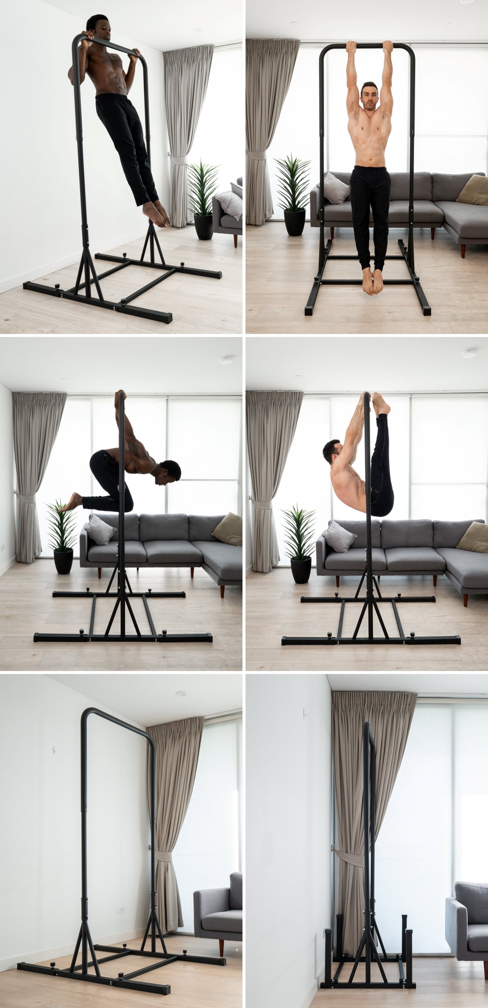 The Big Bar is 81" tall allowing you to perform exercises from a dead hang. Lightweight, foldable legs for compact storage and a secret 44" height for muscle-up training