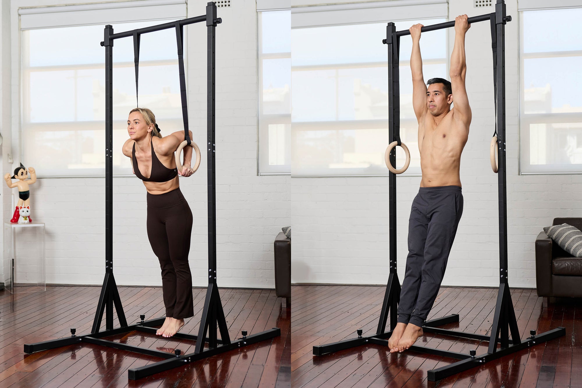 Introducing the Ring Rack. A completely portable, freestanding rig designed for Gymnastics Rings at home. Single-strap design for less mess. Slide the bar up or down to adjust the height, or slide the Rings to the side to use as a pull-up bar. Lightweight, portable with foldable feet for compact storage.