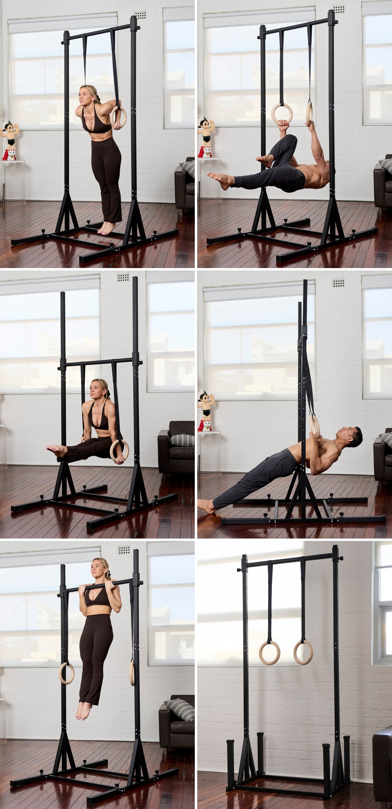 Rings make any exercise harder. Perform dips, rows, L-sits and push-ups. We’ve turned a pull-up bar into a complete upper body workout.