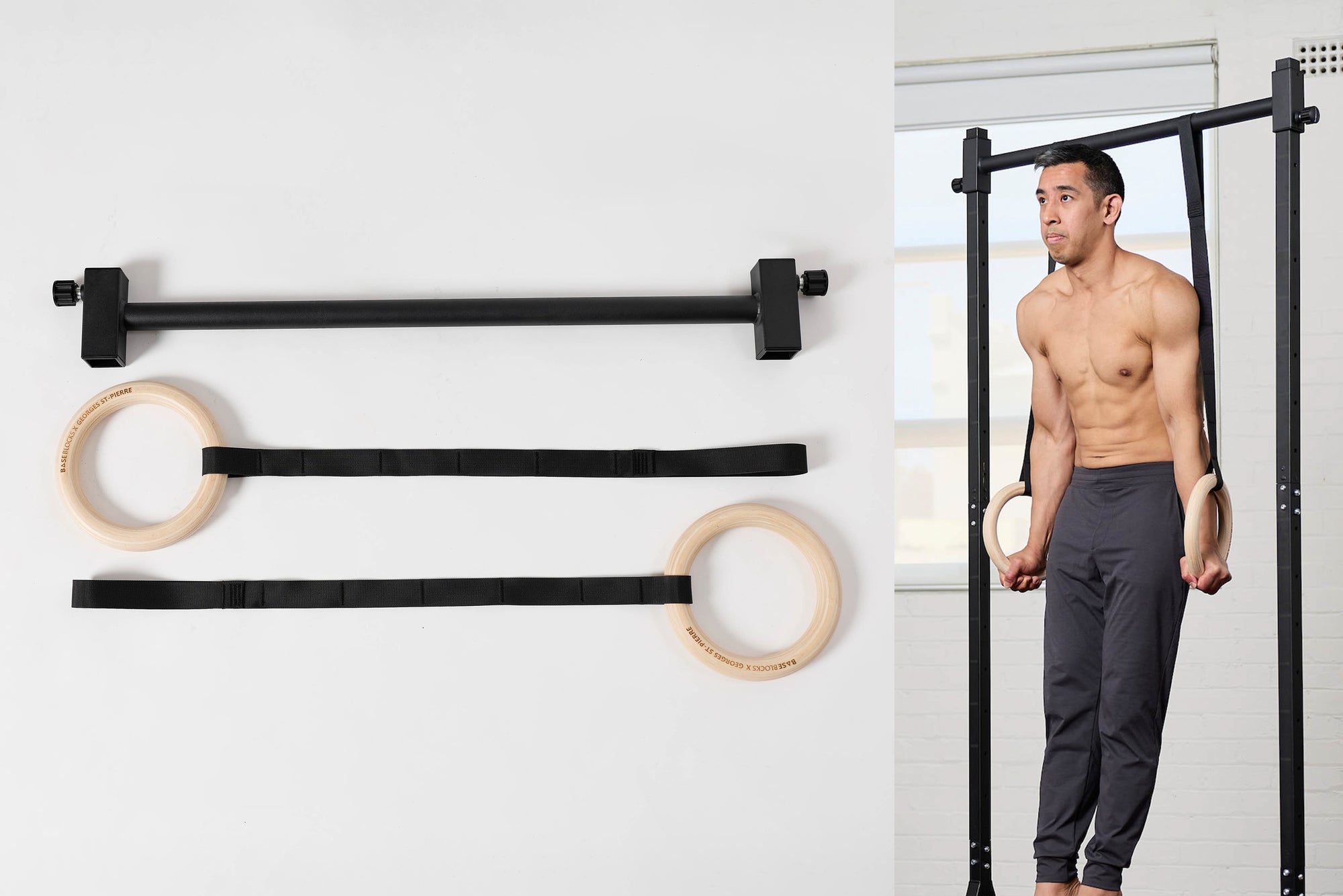 Meet our new add-on for the Big Bar Plus. A smaller diameter bar (1.49") with fixed-length single-strap gymnastics rings for a cleaner look. Our first bar with knurling for a better grip, making it suitable for the whole home. Rings straps not fixed - simply slide them to the side to use the pull-up bar.
