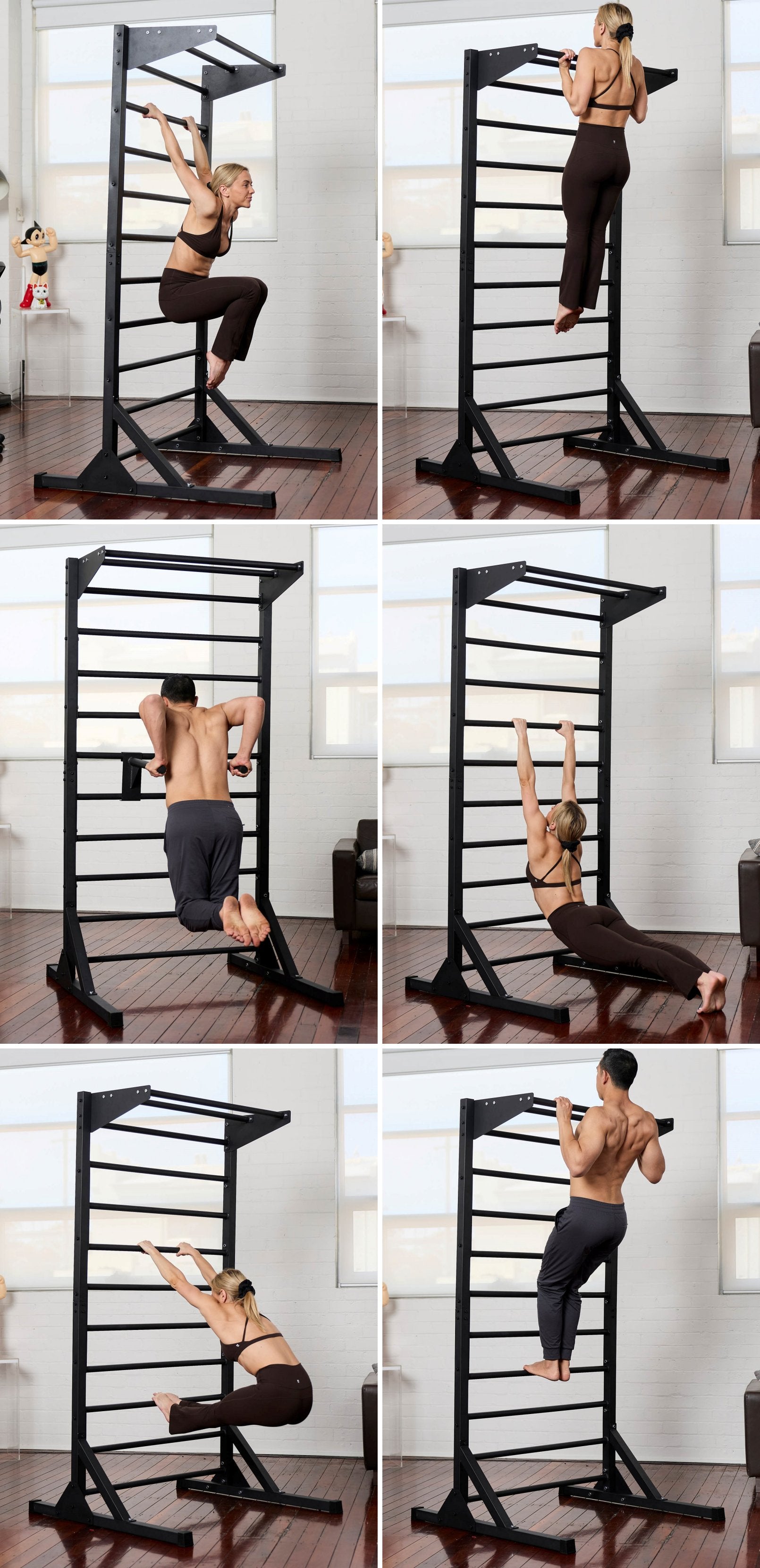 Start with basic stretches or use feet-assistance for chin-ups and dips if you are just starting out. The perfect all-in-one strength and flexibility tool for anyone at home.